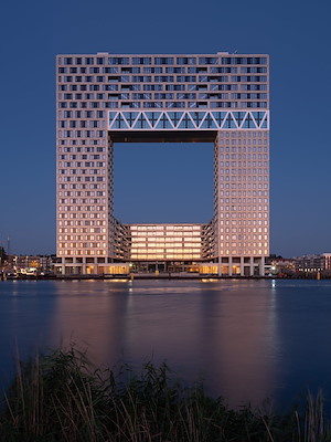 Onder de robuuste hoofdvorm liggen elegante paviljoens met daarin de entrees en een gevarieerd stedelijk programma. Hier ontstaat een zachte overgang tussen binnen en buiten en een menselijke schaal aan de voet van de hoogbouw. Het plein, ontworpen door Hanneke Kijne van Hosper, gaat een dialoog aan met de paviljoens. Met als resultaat een aangename, beschutte ruimte aan het IJ.