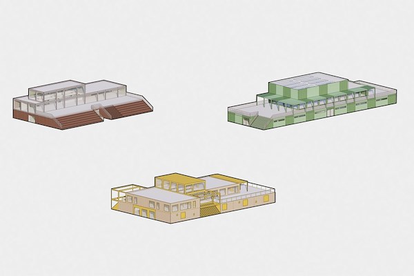 Naast omvang en vorm, kiezen clubs voor hun gevels, daken en binnenwanden uit een palet duurzame en robuuste materialen zoals biobased hout, gerecycled plastic of circulaire steen.