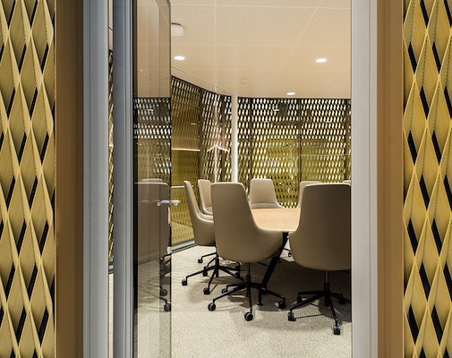 Het middelpunt van het atrium is een opvallend en iconisch element: een volledig 3D-geprinte vergaderruimte. Deze sculptuur vormt een sterk contrast met de vierkante gevels en dakramen, terwijl het patroon verfijning en schoonheid toevoegt aan de robuuste structuur van het gebouw. Dit kunstwerk fungeert niet alleen als blikvanger, maar vormt ook een symbool van herkenning en identiteit voor het advocatenkantoor op de Zuid-as.