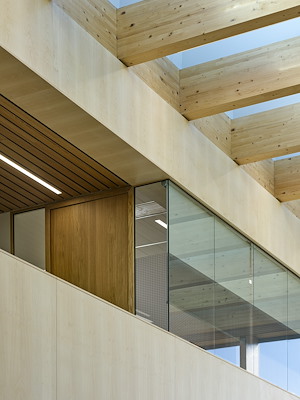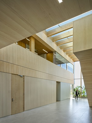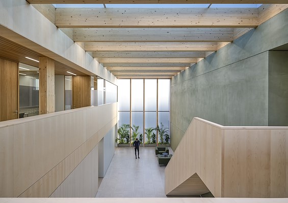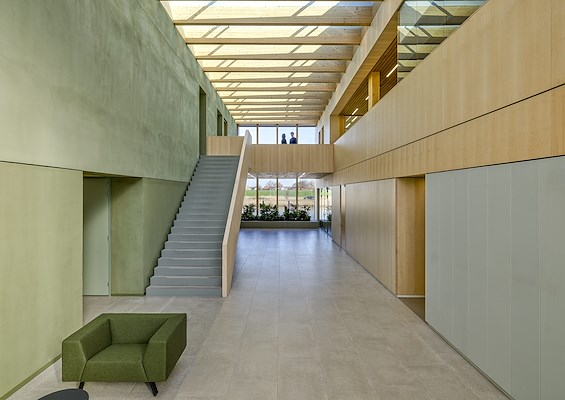 De heldere gebouwstructuur is georganiseerd aan drie lichthoven, die zorgen voor optimale daglichttoetreding en een gezonde werkomgeving. Tegelijkertijd versterken ze de relatie tussen het gebouw en het omringende natuurgebied.
