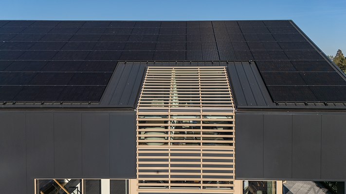 dakpanelen. Het strakke ontwerp van het pand kent een verholen goot, dit geeft het geheel een strakke uitstraling.