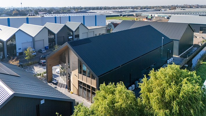 gevelpanelen in de kleur Colorcoat HPS200 UltraĀ® Raven. Ook het dak is in deze kleur gerealiseerd, met de