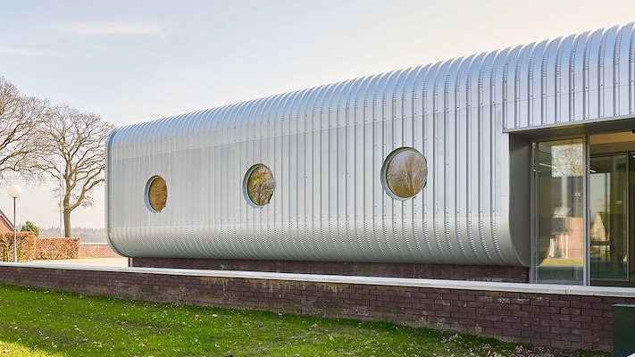 De wachtruimte bestaat uit een met zink beklede halfrond volume die de bezoeker omarmt. De kleurstelling van het interieur bestond uit een groenblauwe gietvloer en wandtegels, deze is aangevuld met een naturel houten lattenstructuur. Dit langwerpige bouwdeel is ingeklemd tussen het bestaande gebouw en de nieuwe kantoorvleugel. Aan de voorzijde is de wachtruimte voorzien van een groot raam dat aankomende cliënten zicht geeft op de wachtruimte en de balie. In het verlengde van dit grote raam zijn verder een patio en een glazen personeelsentree gemaakt.