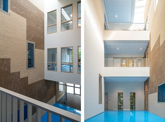 We zijn eindeloos gefascineerd door de archieffoto’s van archeologische afgravingen. Er schuilt een bijzondere grafische kracht en het kleurenpalet van afgegraven aardlagen wordt doorsneden door rechte snedes en coupes, voorzien van markeringen en metingen in het archeologisch veldonderzoek. Deze kracht is vertaalt naar een bijzondere compositie en schakering van verschillende kleuren metselwerk in wisselende verbanden en met gevarieerd voegwerk dat als banen in reliëf over de gevel is aangebracht. Alsof het een archeologische vondst betreft zijn de gevelstenen afkomstig uit restpartijen metselwerk. In deze gevels maken we vervolgens kleine vitrines in een vrije compositie, verspreid over de gevel. De vitrines tonen de bodemschatten als kleine inkijkjes in het depot aan bezoekers en passanten. De materialiteit van de gevel is tevens doorgezet naar het interieur van het atrium. Het normaal gesloten depotgebouw heeft nu een gevel die wél communicatief is.
