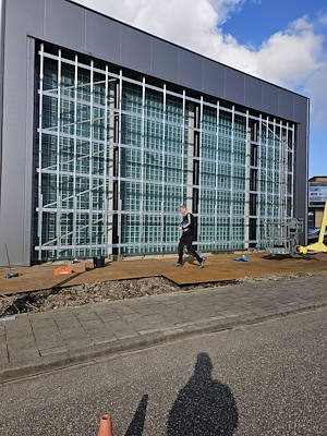 Voor de installatie werkte Van Noort opnieuw samen met TEK Power. Hun kennis van totaaloplossingen maakte hen de logische partner. De gevel bracht de nodige uitdagingen met zich mee: achter de wand stonden drie betonnen kolommen. Daarom werd in samenwerking met Aelex en De Rooy een stalen frame ontworpen dat als stevige basis diende voor het