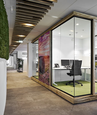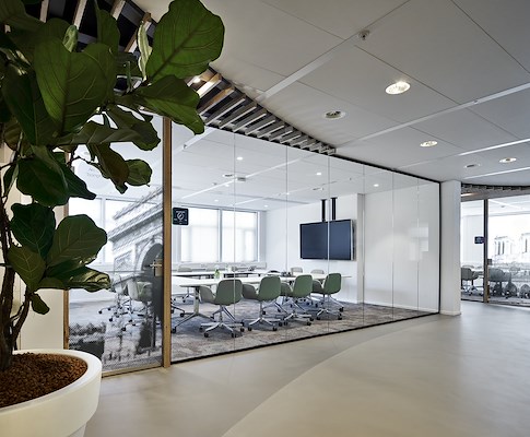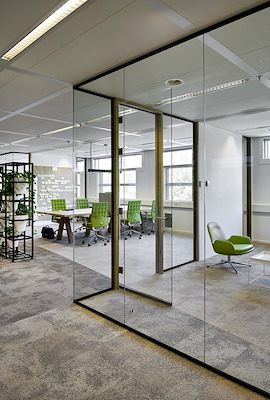 "Een bijzonder geslaagd interieurontwerp van Credit Agricole in Amsterdam. De moderne glazen systeemwanden uit de QbiQ IQ-Single range, gecombineerd met zorgvuldig gekozen houten elementen, vormen een prachtig geheel."