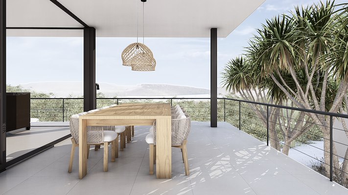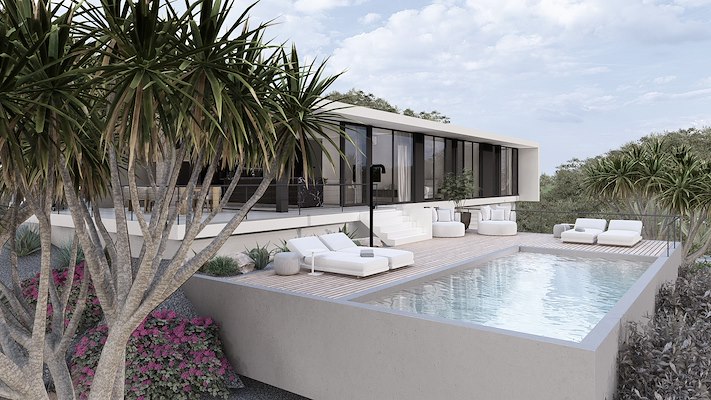 De architectuur volgt de lijnen van de omgeving. Witte, zwarte en grijze vlakken vormen samen met Ibiza stone en meranti hout een ingetogen, modern geheel. Grote glaspartijen omlijsten het weidse uitzicht en zorgen voor een directe relatie met de natuur.