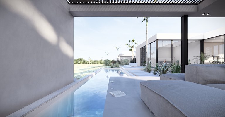 Het ontwerp is helder en functioneel, met een open plattegrond waarin zicht, licht en lucht vrij spel hebben. Blue Bay BO 45 is geen schreeuwend statement, maar een ingetogen villa die juist door eenvoud en verfijning weet te verrassen.