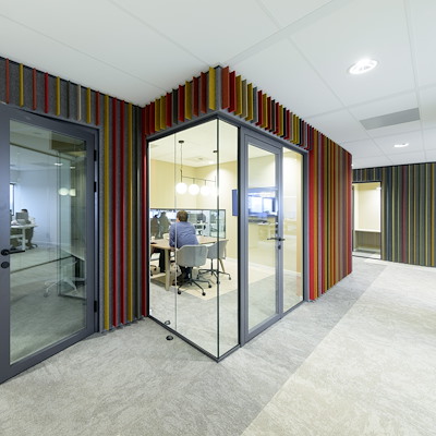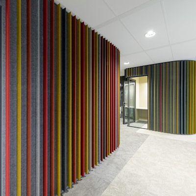 De vergaderruimtes zijn voorzien van een dubbele PET-vilt afwerking: een achterwand van 12 mm dik PET-vilt, met daarop lamellen van hetzelfde materiaal. Elke unit kreeg een unieke uitstraling door variaties in kleurcombinaties. De lamellen zijn stevig bevestigd in uitsparingen in het achterpaneel, wat zorgt voor een strakke afwerking.