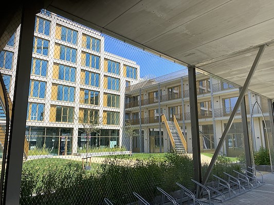 De fietsenstalling hebben we met rvs-kabelgaasnetten afgeschermd. Deze afscherming kan tevens als klimhulp voor planten dienen.