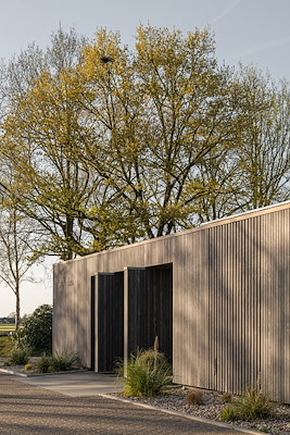 Door het toevoegen van nieuwe gevelopeningen en een verfijnde lamelwerking is een open, transparante sfeer ontstaan, zonder in te leveren op privacy. De houten gevelbekleding geeft het gebouw een warme en zachte uitstraling, passend bij het gevoel dat deze plek moet oproepen.