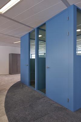 De concentratieruimtes zijn opgebouwd uit hoogwaardige systeemwanden met dubbel glas en zijn ontworpen met hoge akoestische prestaties in gedachten. Dankzij de uitstekende geluidsisolatie ontstaat een stille, besloten omgeving zonder afbreuk te doen aan de open en transparante sfeer van het kantoor. De toepassing van glas zorgt bovendien voor visuele verbinding met de rest van de werkvloer, terwijl privacy en rust behouden blijven.
