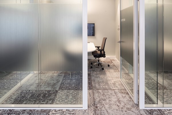 systeemwanden van QbiQ. Deze wanden zijn dubbel beglaasd en voorzien van akoestisch gelaagd glas, waarmee een optimale geluidsisolatie wordt gerealiseerd. Dit maakt de ruimtes uiterst geschikt voor geconcentreerd werken, vertrouwelijke gesprekken en hybride overlegvormen. De strakke aluminium profielen en het minimalistische ontwerp van de iQ-Structural sluiten perfect aan bij de moderne uitstraling die Rabobank voor ogen had, terwijl het transparante karakter van de wanden zorgt voor een open en lichte werkomgeving.