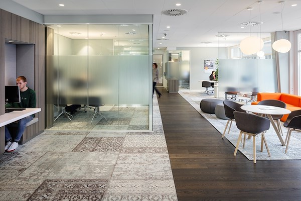 Wat deze inrichting bijzonder maakt, is de manier waarop moderne kantooroplossingen gecombineerd zijn met sfeervolle details. Zo is het trendy en ergonomisch ontworpen meubilair zorgvuldig afgestemd op de wensen van de gebruikers en de visuele identiteit van de organisatie. Vintage karpetten, subtiel verspreid door de verschillende werk- en overlegzones, zorgen voor een huiselijke toets en brengen kleur en textuur in de ruimte. Deze elementen geven niet alleen visuele warmte, maar dragen ook bij aan de akoestiek van de open kantoorvloer.