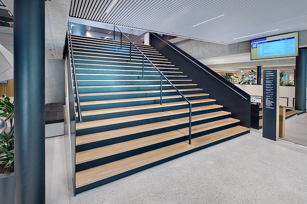 Een centraal element in de entreezone is de stalen podiumtrap. Deze trap vormt een visueel statement en sluit naadloos aan bij de architectonische lijn van het gebouw.