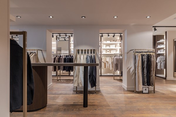 De kasten zijn voorzien van een flexibel hangsysteem en geïntegreerde verlichting, zodat de kleding optimaal gepresenteerd wordt. De eikenhouten vloer heeft een tweede leven gekregen en sluit perfect aan bij de uitstraling van de boetiek. Het geheel is verfijnd en praktisch, en biedt een luxe winkelervaring voor zowel heren als kinderen.