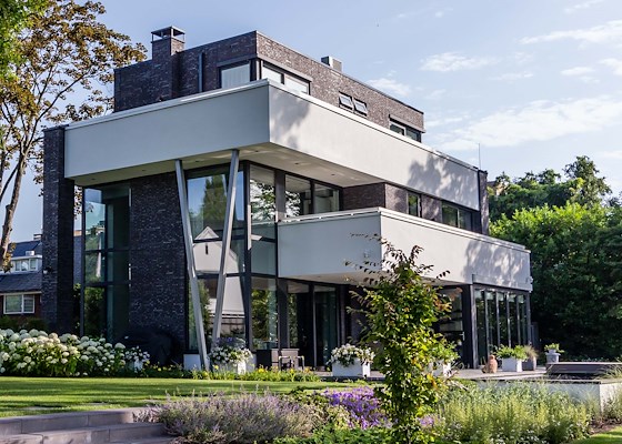 Villa V is een eigentijdse villa in Voorburg, gelegen aan de oevers van de Vliet. Het woonhuis vormt een harmonieus samenspel van architectuur en natuur. Geïnspireerd door de omliggende groene omgeving is de woning ontworpen met riante terrassen die doen denken aan het iconische ‘Fallingwater’ van Frank Lloyd Wright. De terrassen creëren een sterke verbinding met de natuurlijke lagen van het terrein. Grote glaspartijen zorgen voor een naadloze overgang tussen binnen en buiten, terwijl de hoge plafonds niet alleen een gevoel van ruimte geven, maar ook het lichtspel en de reflecties van het water uit de naastgelegen vijver subtiel in het interieur brengen. De expressieve kolommen en het spel van licht en schaduw versterken de dynamiek van het ontwerp.