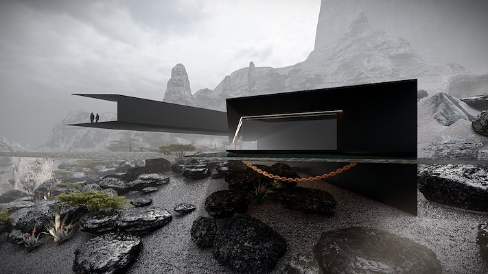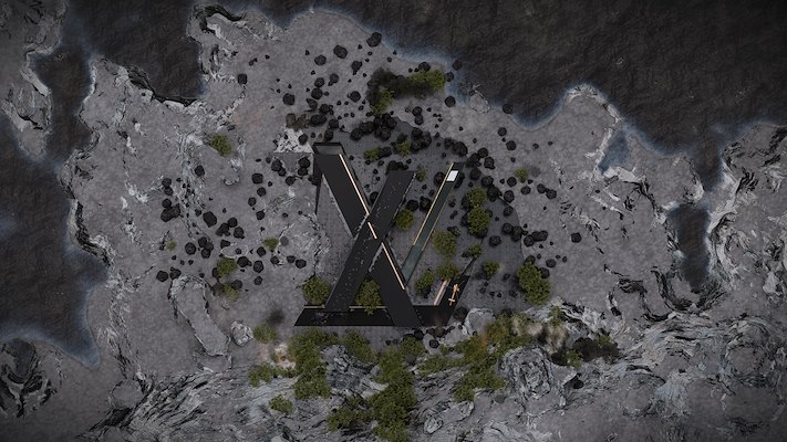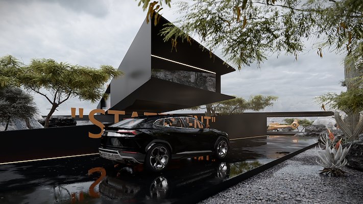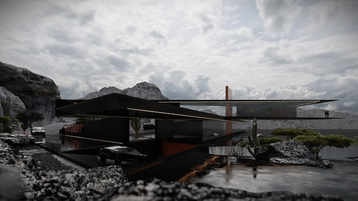 Strakke zwarte volumes, grote overstekken en een open ligging in het woestijnlandschap creëren een uitgesproken, haast monumentale uitstraling. Elk detail is bewust weggelaten of juist vergroot, precies zoals Abloh het zelf zou doen.