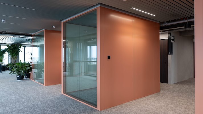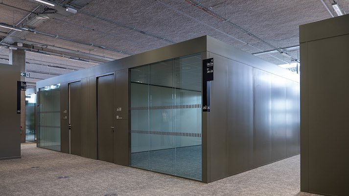 In dat kader ontwikkelde QbiQ speciaal voor ZIN een reeks innovatieve, vrijstaande kantoorunits van het type QQ2 XL. Deze extra grote units combineren transparantie en privacy dankzij het gebruik van glazen puien en gesloten, stalen wanden. De integratie van een dakconstructie zorgt ervoor dat deze units functioneren als volwaardige, akoestisch afgesloten ruimtes binnen de open werkvloeren. Dankzij een nieuw type stalen deur voldoet de QQ2 XL Unit bovendien aan de strenge akoestische eisen die voor ZIN zijn gesteld. Geluidscomfort is immers essentieel in een omgeving die gedeeld wordt door honderden gebruikers.
