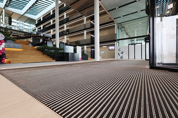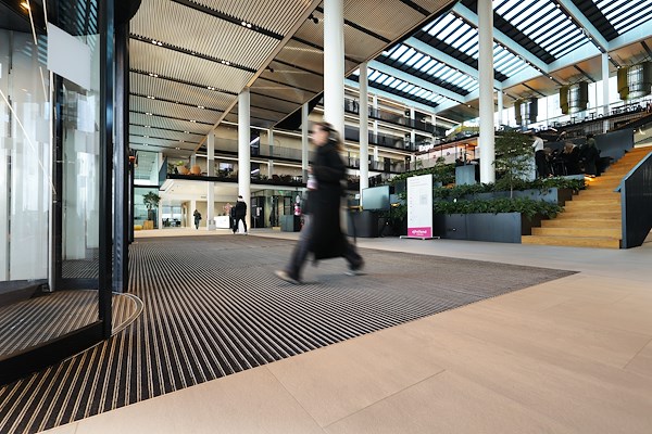 Anders dan deze gevelproducten is de Storax Combimat Tapijt toegepast in de entree van het gebouw. Met een vloeroppervlak van circa 30.000 m² en negen verdiepingen speelt de entreezone een sleutelrol in het dagelijks gebruik van het pand. Hier komen studenten, medewerkers en bezoekers, vaak via het plein waar de gevel iets terugwijkt met grote aantallen het pand binnen. Daarom is juist in deze zone is een hoogwaardige entreemat essentieel. De Storax Combimat Tapijt biedt hier de perfecte oplossing