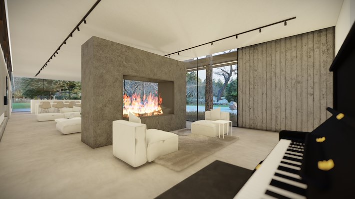 Zichtbeton, zwarte stucco, zwarte aluminium daklijnen en verticale houten latten vormen samen een krachtig, maar natuurlijk geheel. Het interieur wordt gekenmerkt door een betonnen vloer, zachte tinten en een serene, minimalistische sfeer.