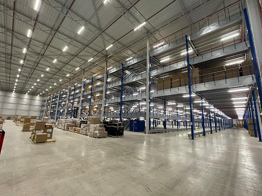 Transport/montage: het transport en de montage van de mezzaninevloer werden efficiënt uitgevoerd, waarbij 98 vrachtwagens werden ingezet en de installatietijd tot slechts 5 maanden beperkt bleef.
