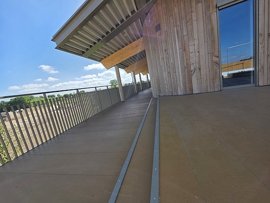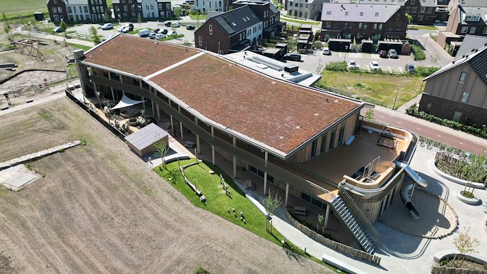 In het kindcentrum komen vorm en functie perfect samen. De speelse galerijen bieden extra buitenruimte die, dankzij de toepassing van FiCor Pyro30 galerijdekdelen ook bijzonder veilig is; slipvast, slijtvast, ongevoelig voor invloeden van buitenaf en ook bij brand nog tenminste 30 minuten bruikbaar als veilige vluchtweg. Daarnaast zijn FiCor galerijdekdelen leverbaar in bijna iedere RAL-kleur. Zo werd gezorgd voor een perfecte aansluiting bij de met populierenhout bekleedde wanden van het gebouw.