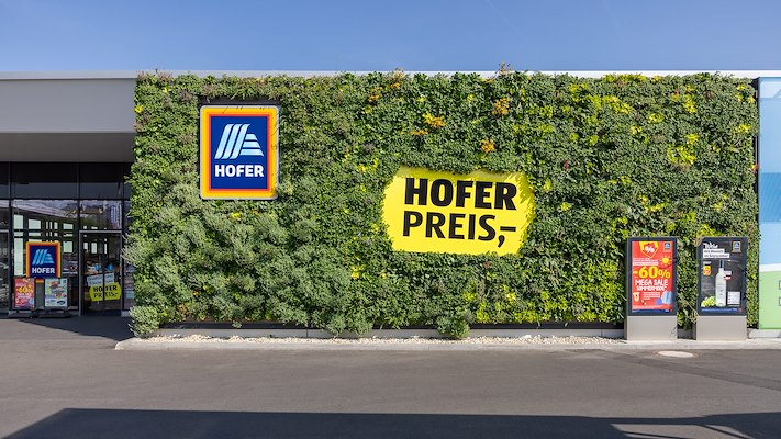 Initiatiefnemer Hofer KG toonde zelf ambitie door een groene gevel te realiseren aan hun filiaal, als onderdeel van hun bredere duurzaamheidsvisie: