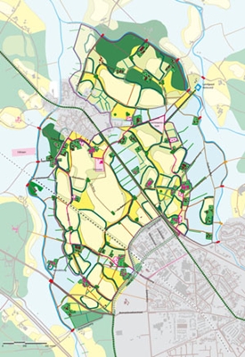 De Zendersche Esch, gelegen tussen Almelo en Borne, is het laatste stukje landelijk gebied in de netwerkstad Twente. In het ontwerp voor het landschapspark (560 ha) stellen wij voor om een netwerk van beplantingen, openbare ruimten (ca. 50 ha.) en paden op te spannen. Daartussen kan blijvend worden geboerd. De beplantingen versterken de ruimtelijke contrasten en de cultuurhistorische opbouw van het gebied. In het ontwerp is het productielandschap en het recreatielandschap met elkaar vervlochten: over het landelijke gebied wordt een ‘netwerkpark’ gespannen. Het park is geen ‘traditioneel’ park maar bestaat vooral uit een netwerk van paden en beplantingen en openbare ruimte waarin niets is vastgelegd en ‘alles’ mogelijk is. De openbare ruimten liggen verspreid in het gebied, tussen de waardevolle essen. Het landschapspark wordt omzoomd met een skeelerbaan.