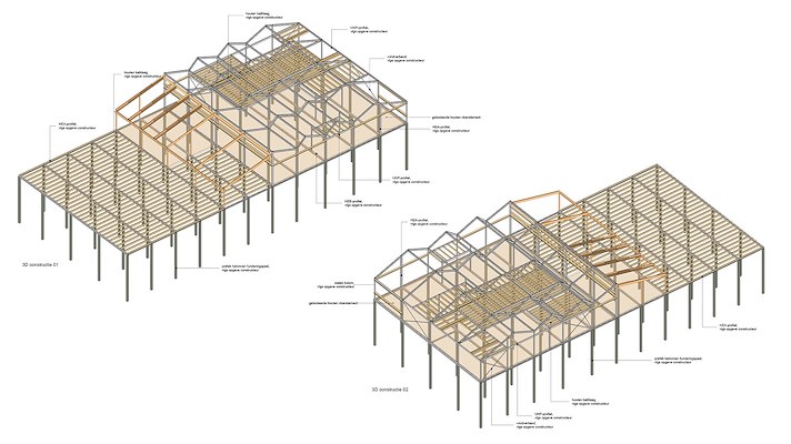 Het programma van eisen is omgezet in een massa, waarbij de nokrichting parallel aan de duinvoet ligt. De nok- goothoogte en dakhelling zijn binnen de huidige regelgeveling ontworpen. Door de nokken onderling te laten verspringen en aan te sluiten op het programma, ontstaat een dynamisch gevelbeeld die ook in het interieur benadrukt wordt door lichtinval van de vele dakramen.
