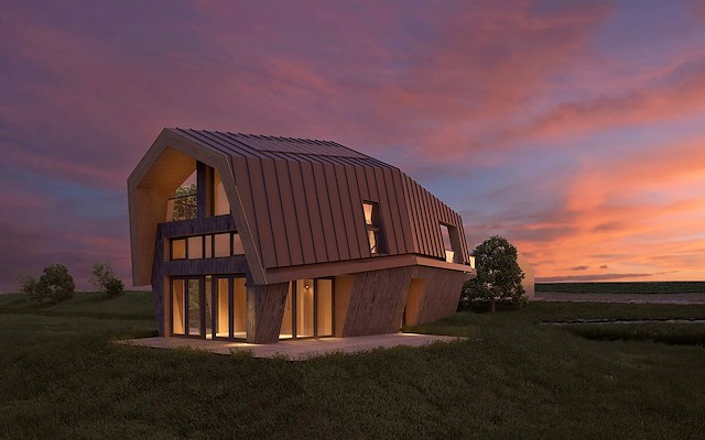 Vanaf de eerste verdieping gaat het interieur een visuele verbinding aan met het Grevelingenmeer. De hoofdconstructie wordt gemaakt van CLT hout (cross laminated timber). De unieke vorm met de scheve wanden en daken is hiermee eenvoudig te realiseren. Het grootste gedeelte van deze houtconstructie blijft in het zicht waarmee het huis een natuurlijke warme uitstraling krijgt die aansluit op de omgeving.