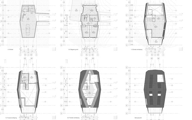 Als uitgangspunt voor het vormconcept is een zevenhoek genomen, een zogenaamde heptagon. De heptagon doorsnede is zo zuiver mogelijk gehouden met de grootste maat in het hart van het gebouw. De kopse kanten zijn geknepen om maximale ruimtelijkheid en geborgenheid te geven binnen de toegestane 650m3 voor het hoofdvolume. De vloeren volgen eenzelfde principe wat resulteert in een speelse indeling met vides, doorzichten en split level oplossingen.