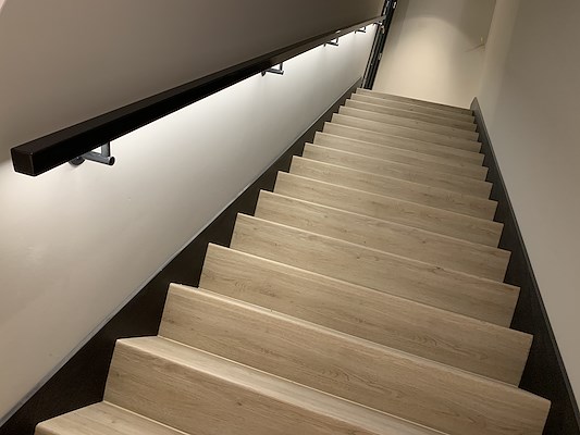 De verlichte, zwart gecoate trapleuningen in Rusthoff Sassenheim zijn een goed voorbeeld van hoe kleine ingrepen het dagelijks gebruik van een gebouw merkbaar kunnen verbeteren – subtiel aanwezig, maar essentieel in beleving en comfort.