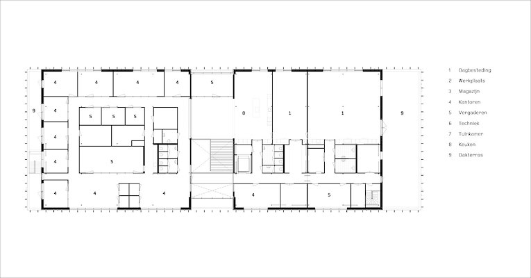 Het gebouw is functioneel ingedeeld, met duidelijke keuzes voor rust en activiteit: aan de voorzijde, de drukkere straatzijde, op de begane grond bevinden zich de meer gesloten facilitaire ruimtes. Aan de achterzijde zijn de dagbestedingsruimtes gesitueerd, grenzend aan een beschutte tuin die kan worden gebruikt voor de buitenactiviteiten.