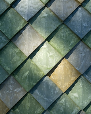 , uitgevoerd in vier zorgvuldig gekozen tinten: drie natuurlijke groentonen (G1, G2, G3) en een warme okerkleur (O1). De tegels zijn gemaakt van