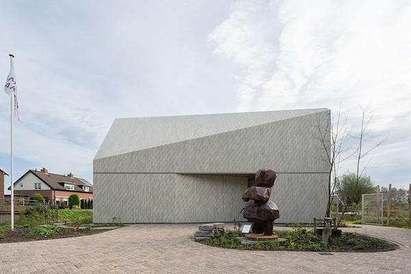 Het gebouw is zowel ingetogen als uitgesproken. Het past in de schaal en maat van het dorp en sluit aan op het straatbeeld. Naar de straat toe voegt het silhouet zich naadloos in de vorm en de dakopbouw van de woningen in de omgeving. Wie er omheen loopt ontdekt een paviljoen met een eigen identiteit. Een subtiel verloop in de dakopbouw, een spel met open en gesloten gevels en de tegels zorgen ervoor dat het gebouw er van iedere zijde anders uitziet én een bescheiden fysieke impact heeft.