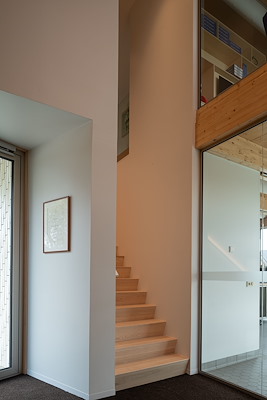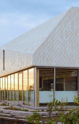 Het houten casco vormt de ruggengraat van het gebouw en bepaalt zowel de vorm als de uitstraling. Strategisch geplaatste glazen openingen maken de circulaire constructie ook aan de buitenkant zichtbaar. Het dak is geïsoleerd met biobased materiaal en in het landschap zijn hergebruikte Stelconplaten zorgvuldig geïntegreerd. De gevel is ontworpen met aandacht voor het kleurverloop. Een combinatie van glazuur en craquelé geeft het gebouw een uniek karakter en laat het subtiel opgaan in de omgeving.
