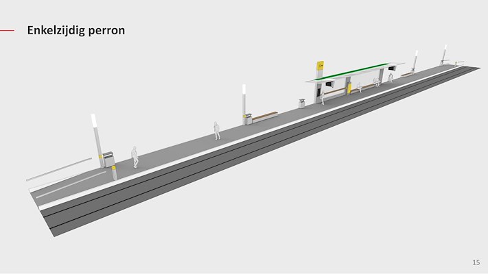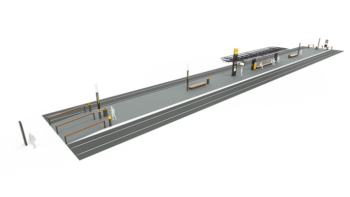 Het ontwerp voor de complete (her)inrichting van de perrons bestaat uit verschillende functionele modules die afhankelijk van de lokale situatie op de haltes kunnen worden geplaatst. Het ontwerp kan worden aangepast om tot een samenhangende stedelijke inrichting te komen op basis van de intensiteit op individuele locaties en de lokale inpassingsmogelijkheden.