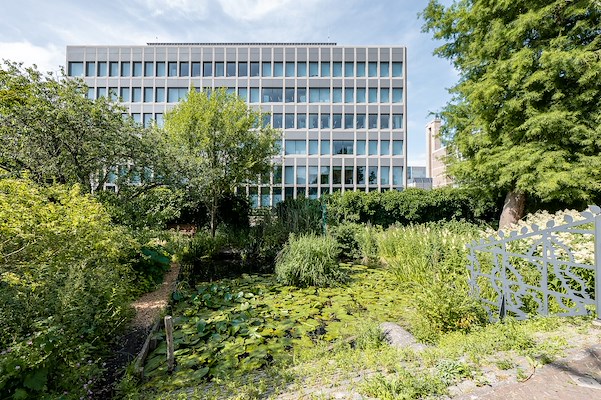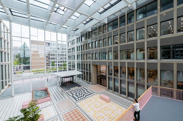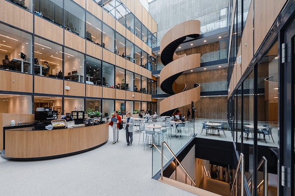 Het binnenhof, een vier verdiepingen hoge patio met een glazen dak, zorgt voor licht en lucht en verbindt alle verdiepingen en afdelingen met elkaar; er ligt een grote collegezaal aan en mensen kunnen er elkaar onmoeten bij de koffiebar. Het is een sociale ruimte, de centrale ontmoetingsplek van het gebouw. Deze rol wordt versterkt door de in het oog springende, karakteristieke wenteltrap naar de bovengelegen verdiepingen; de organische vorm van deze wenteltrap vormt een contrast met de lineaire opzet van het gebouw.