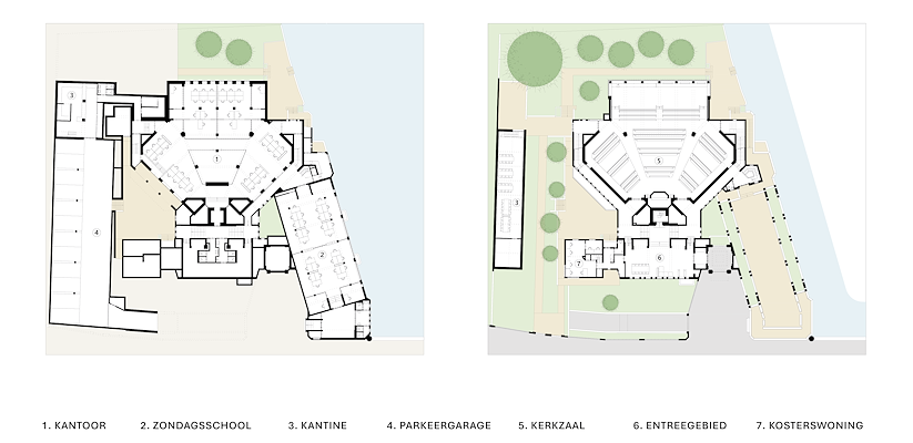 Door de kelderruimte van de kerk meer openheid en daglicht te geven kan deze functioneel worden ingezet. Een goede verbinding met de ondergrondse nieuwbouw en de voormalige zondagsschool is hierdoor mogelijk. De omarmende ontsluitingsstructuur van de kerkzaal en het balkon die zich zo duidelijk aftekent in de externe gebouwvorm is in de kelder doorgezet. Hierdoor blijft er een logische structuur in het gebouw bestaan waarbij alle lagen vanuit de grote hal aan de voorzijde goed ontsloten kunnen worden.