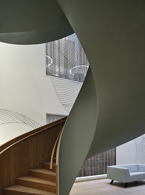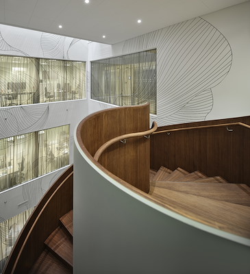 De trap, met stalen balustrades over de volledige diepte, verbindt drie verdiepingen en stijgt in twee wentelingen naar de daklichten van het atrium. Twee kenmerken zijn ongebruikelijk. Het eerste is de manier waarop de eiken treden en stootborden zijn geplaatst op de gladde, geometrisch ‘zuivere’ EeSoffit™ – een zeldzame combinatie. Minder opvallend, maar zeer effectief in het creëren van een sfeer in het atrium, is de manier waarop de groen geschilderde trap wordt verlicht: relatief bleek daglicht valt op het bovenste gedeelte van de trap, terwijl het lagere gedeelte wordt verlicht met warmer kunstlicht.