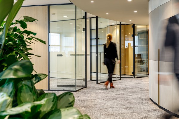De kantoorverdiepingen van Houthoff kenmerken zich door open vloervelden, centrale ontmoetingsplekken en strategisch geplaatste vergaderruimten rond de kenmerkende ronde kern van het gebouw. Om visuele openheid te combineren met de vereiste vertrouwelijkheid van een advocatenkantoor, koos het ontwerpteam voor de inzet van QbiQ’s glazen scheidingswanden met akoestische eigenschappen.