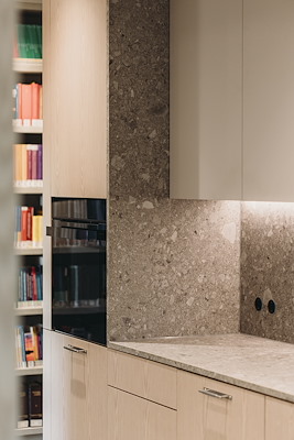 In het hart van het kantoor fungeert een opvallend paviljoen als centraal ontmoetingspunt – als een blokhut die je tijdens een bergwandeling onverwachts tegenkomt. Een beschutte plek van warmte en rust, waar de buitenwereld op subtiele wijze naar binnen wordt gehaald. Het kenmerkende plafondontwerp versterkt het gevoel van openheid en transformeert een voorheen afgesloten ruimte tot een uitnodigende sociale hub. Warme, huiselijke verlichting, zachte stoffering en open schappen creëren een comfortabele en gastvrije sfeer, terwijl een verborgen bar ervoor zorgt dat de ontvangstruimte moeiteloos overgaat in een levendige ontmoetingsplek na werktijd.