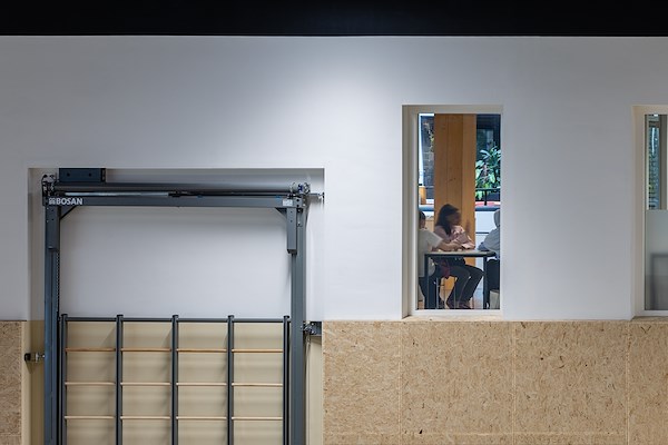 Tussen de bouwdelen ligt een houten verbindingsstuk met daarin de aula – het levendige hart van de school en de schakel naar de sporthallen. Door dit houten volume te laten verspringen ten opzichte van de rest van het gebouw, zijn de entrees goed herkenbaar. De schuine daken geven het gebouw karakter, brengen noorderlicht naar binnen en bieden ruimte voor zonnepanelen op de zuidzijde. Tegelijkertijd maken ze een slimme integratie van installaties mogelijk.
