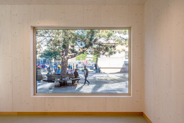 Doorkijkjes in het interieur, naar de andere ruimtes maar ook naar buiten, zorgen ervoor dat begeleiders goed zicht hebben op alles wat er in en om het gebouw gebeurt.