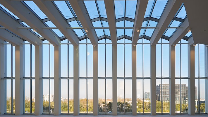 De kantoorgevel bestaat uit een innovatief systeem met verdiepingshoge elementen, geassembleerd met kozijnprofielen en zonwerend glas. In de onderste bouwlagen zijn de elementen relatief vlak, maar naarmate het gebouw omhoog reikt, hellen ze steeds verder naar voren. Zo ontstaat een dynamisch gevelbeeld dat bovendien zoninstraling – met name in de zomer – aanzienlijk vermindert, waardoor er minder koelcapaciteit nodig is. De elementen zijn gemaakt van biocomposiet, geproduceerd uit gerecyclede PET-flessen. Op de bovenzijde van de gevelelementen worden zonnecellen geïntegreerd, optimaal gericht op de zon, maar vrijwel onzichtbaar vanaf straatniveau.