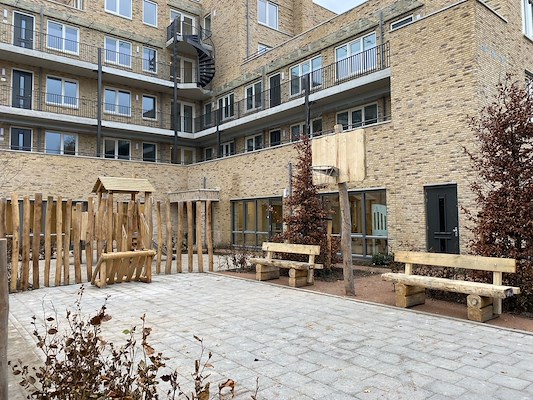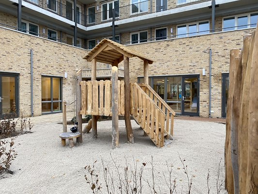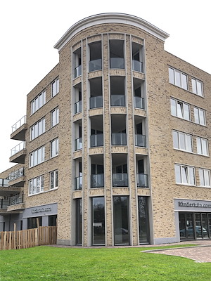 - architectuur. Het gebouw sluit naadloos aan op de naastgelegen woningen in dezelfde architectuur en kleurstelling. Het bescheiden ontwerp is subtiel en zorgvuldig gedetailleerd met ambachtelijke en robuuste materialen. Het kinderdagverblijf op de begane grond heeft een afwijkend gevelmateriaal gekregen; het enigszins gewolkt aangebracht gevelstucwerk nodigt bijna uit om te strelen.