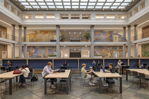 De architectuur van het nieuwe atrium refereert aan de aula, door ook hier balustrades te situeren en de kolommen tot aan de bovenste gaanderij voor die balustrades langs te laten lopen. Waar de fresco’s in de aula horizontaal zijn, kreeg het atrium een verticale wand voor kunst. Door de komst van het atrium, staan de voormalige buitengevels van de binnentuin nu binnen, net als de charmante, halfronde trap naar de ruimte boven de entree, die in de nieuwe situatie dienstdoet als mediatheek. Eyecatcher is de houten tribunetrap, compleet met theaterlampen en een gordijn.