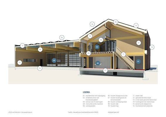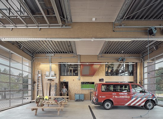 De brandweerkazerne in Twello is circulair ontworpen, met een houten hoofddraagconstructie, houtskeletbouw-gevels met steenstrips en een losmaakbare opbouw. Dit bespaart materiaal en biedt flexibiliteit voor toekomstig hergebruik. De gekozen materialen zijn onderhoudsarm, robuust en grotendeels biobased. Met een BCI-score van 61% – tegenover 29–49% bij vergelijkbare projecten – behoort het gebouw tot de koplopers in circulair bouwen. Terwijl er nog relatief weinig tweedehands materialen zijn toegepast, wat de hergebruikspotentie benadrukt. Het energieconcept is afgestemd op het gebruik: geen overgedimensioneerde installaties, maar een slimme airco-unit en PV-panelen maken het gebouw energie-neutraal. De buitenruimte draagt met waterdoorlatende verharding, vleermuiskasten en een wadi bij aan klimaatadaptatie en biodiversiteit. Ook op sociaal vlak is het duurzaam: de aangename werkomgeving bevordert welzijn en eigenaarschap bij het korps. Zo is Twello klaar voor de toekomst.