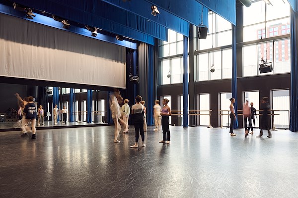 Lichte, open studio's aan de gevelzijden van het gebouw, de grijze dansvloer sluit aan bij het casco